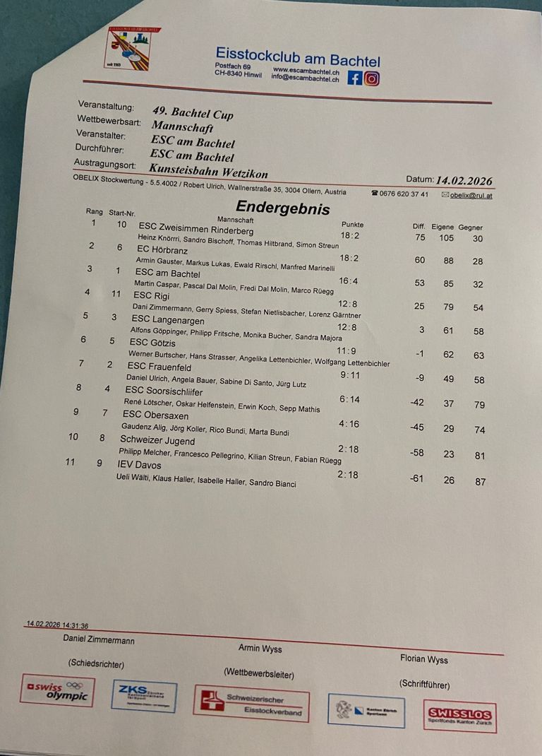 Die Eisstockschützen (innen) Moni Bucher, Sandra Majora, Philipp Fritsch und Alfons Göppinger nahmen am stark besetzten Turnier von Am Bachtel in der Schweiz teil. Das Turnier wurde im wunderschönen Eisstadion in Wetzikon ausgetragen. Mit 12:8 Punkten erreichte die Mannschaft des ESC einen starken 5ten Rang. Im zweitletzten Spiel, stieß man noch, mit einem Sieg, den ESC Am Bachtel vom Thron des Pokalsiegers.