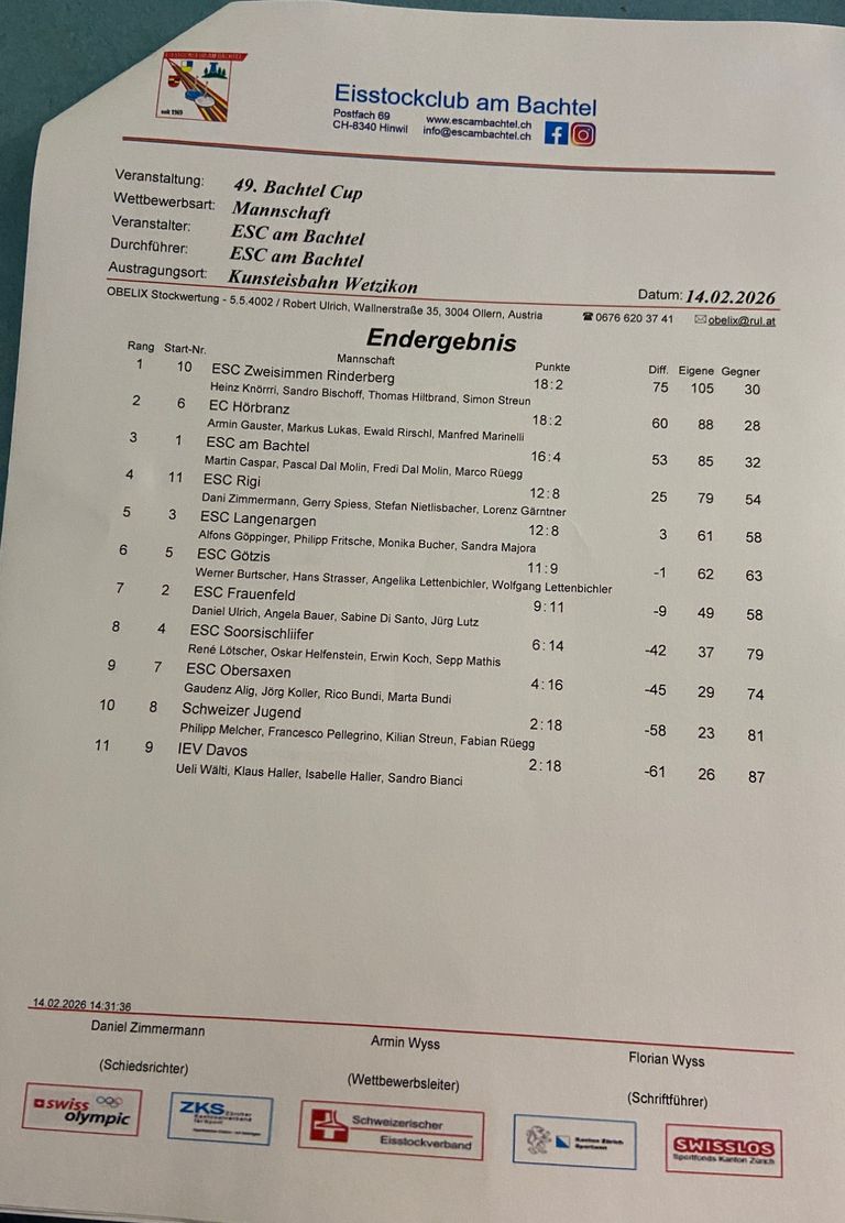 Die Eisstockschützen (innen) Moni Bucher, Sandra Majora, Philipp Fritsch und Alfons Göppinger nahmen am stark besetzten Turnier von Am Bachtel in der Schweiz teil. Das Turnier wurde im wunderschönen Eisstadion in Wetzikon ausgetragen. Mit 12:8 Punkten erreichte die Mannschaft des ESC einen starken 5ten Rang. Im zweitletzten Spiel, stieß man noch, mit einem Sieg, den ESC Am Bachtel vom Thron des Pokalsiegers.